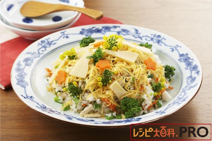 飾り用にたけのこ少々、花型に抜いたにんじん、錦糸卵を取り分け、(1)に混ぜて器に盛る。