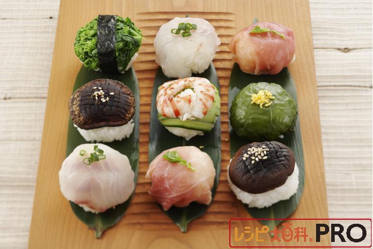 たいのにぎりには小ねぎ、生ハムにはクレソン、しいたけにはごま、青菜にはゆで卵の黄身をそれぞれのせる。