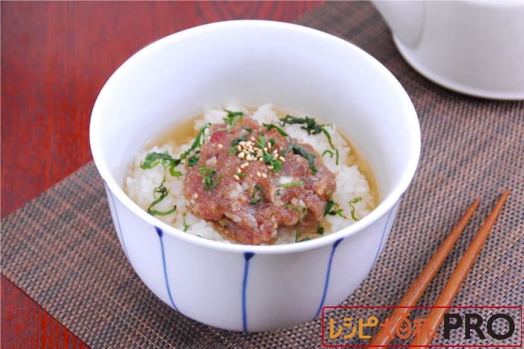 茶碗にご飯をよそい、(1)をのせ、(2)を注ぎ、Cを散らす。