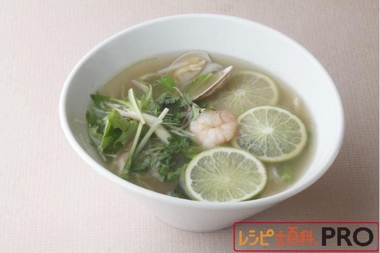 (2)のフォーに火が通ったら具材・スープとともに器に盛る。