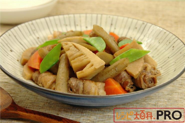 (2)の鍋の油を拭き取って油を入れ、ごぼうを加えてサッと炒め、にんじん、 たけのこを加えて、さらに炒める。