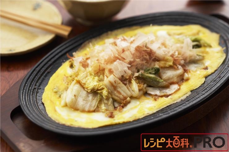 しょうゆをふりかけ、溶き卵を流し入れる。半熟になったら火を止め、削り節をふりかける。