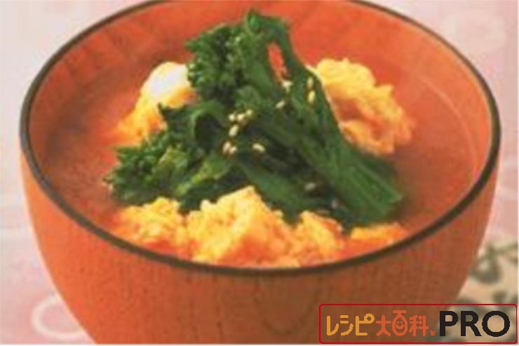 菜の花に火が通ったら弱火にし、みそを溶き入れ、溶き卵を流し入れて浮いてきたら火を止める。