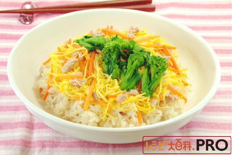 器に(3)を盛り、錦糸卵、残りのツナ・にんじん、菜の花を飾る。