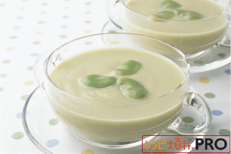 じゃがいもの冷製ポタージュに、そら豆の色と風味をプラス