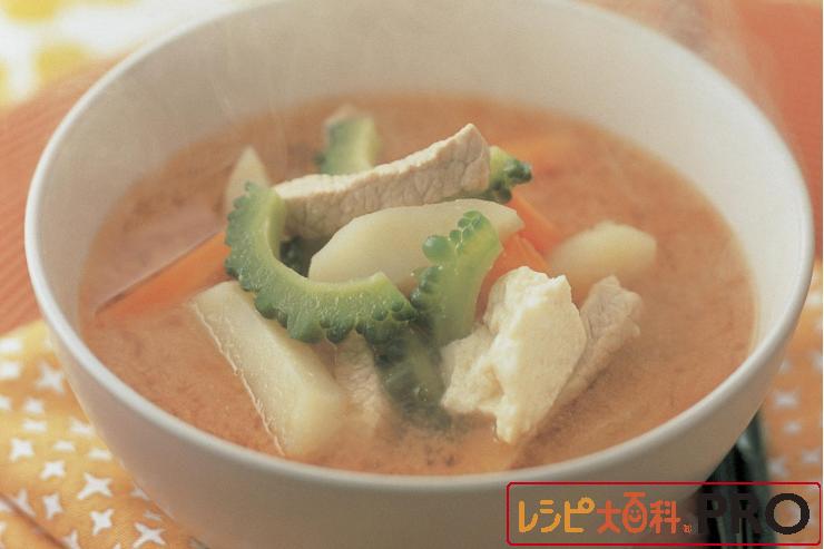 材料に火が通ったらゴーヤを加え、豆腐をちぎり入れてひと煮し、火を弱めてみそを溶き入れ、
