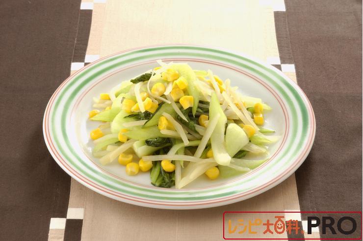 チンゲン菜とじゃがいも、コーンの塩炒め