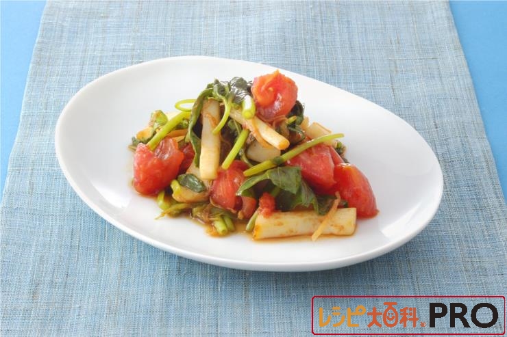 Bを加え、トマト、根みつばの葉も加え、手早く炒め合わせる。