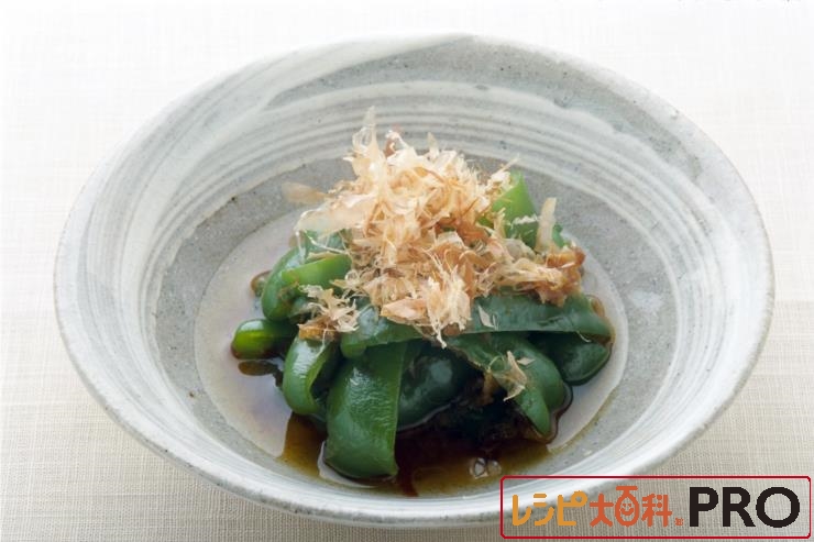 鍋にA、削り節半量を入れて火にかけ、ピーマンを加え、しんなりするまで煮る。