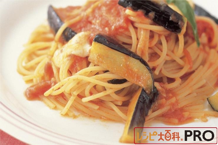 なすを戻し入れ、ひと煮し、モッツァレラチーズ、ゆでたスパゲッティ、ゆで汁100mlを加えてあえる。