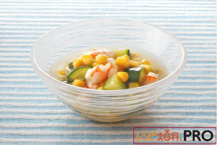 ズッキーニを入れる。再沸騰したらえびを加え、えびの色が変わったらとうもろこし、しょうゆを加える。