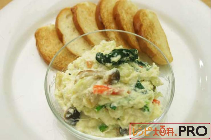 話題の塩豆腐でヘルシーに仕上げたポテトサラダ。パンを添えてディップにも。