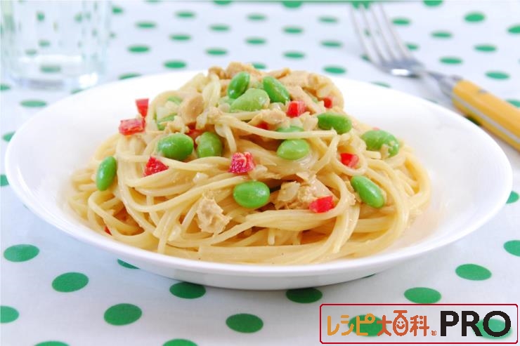 Bを加えてサッと煮て、枝豆、塩ゆでしたスパゲッティ、パプリカを加えて炒め合わせる。
