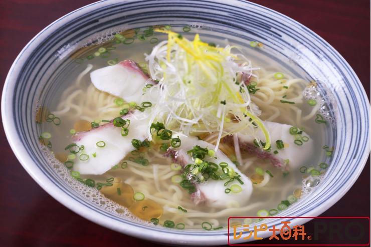 中華めんをゆで、器に盛り、たいをのせ、上から熱々にした(1)を注ぐ。