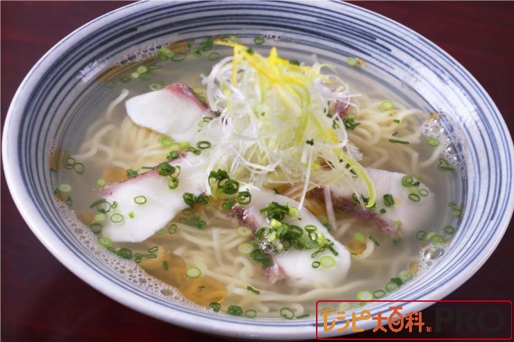 中華めんをゆで、器に盛り、たいをのせ、上から熱々にした(1)を注ぐ。
