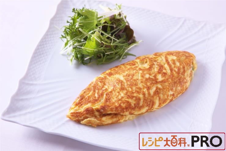 フライパンにバターをひき、泡立ってきたら、(1)を流し入れ、フライパンをゆすりながら、ふんわりとしたオムレツを焼き上げる。