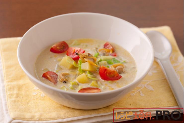 (1)の鍋にバターを入れて溶かし、Bを加え中火で炒める。Cを加え野菜がやわらかくなるまで煮込む。