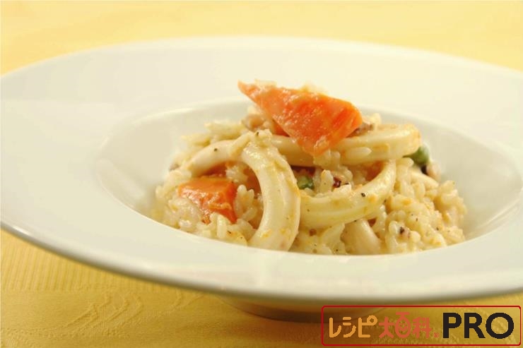 いかのうま味たっぷりのリゾット。すりおろしたにんじんを加え、彩りよく