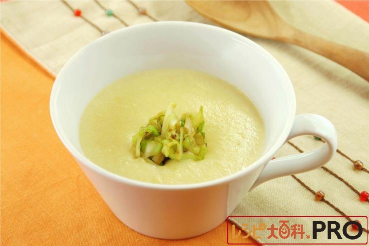 (2)にDを加えて温め、ミキサーにかけ、器に注ぎ、(3)を飾る。