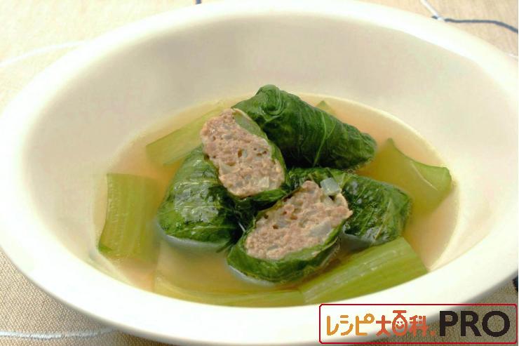チンゲン菜の葉1枚を広げ、(1)の肉だんご1個をのせて包む。残りも同様にして包む。