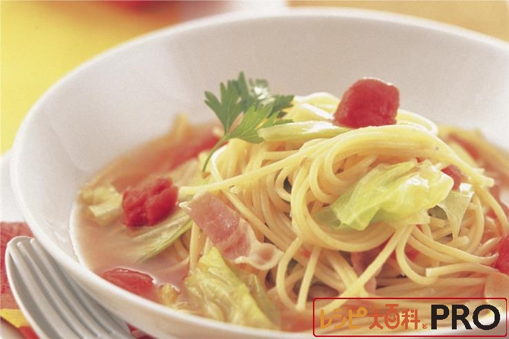 「コンソメ」5g、(1)のゆで汁を加える。煮立ったら(1)のスパゲッティ・キャベツを加えてひと煮し、Cで味を調える。