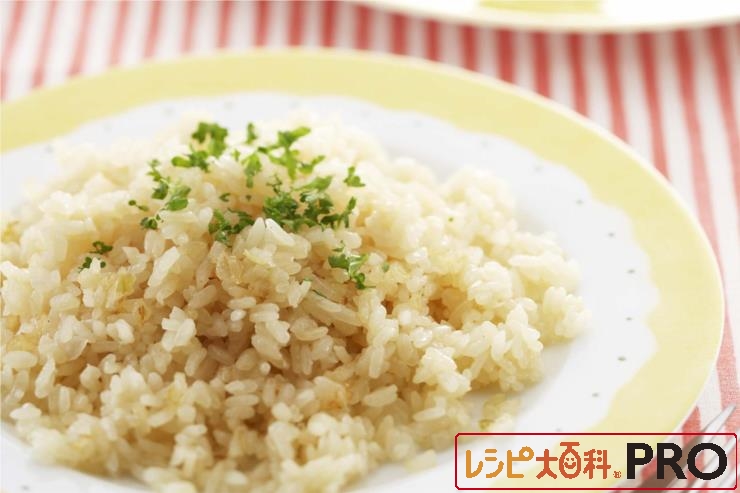 炊飯器でコンソメとともにご飯を炊き、バターを混ぜて仕上げます