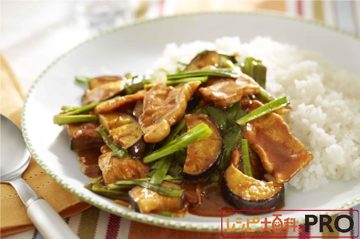 フライパンにごま油を熱し、豚肉を強火で炒め、火が通ったら、なす、Aを加えて炒める。