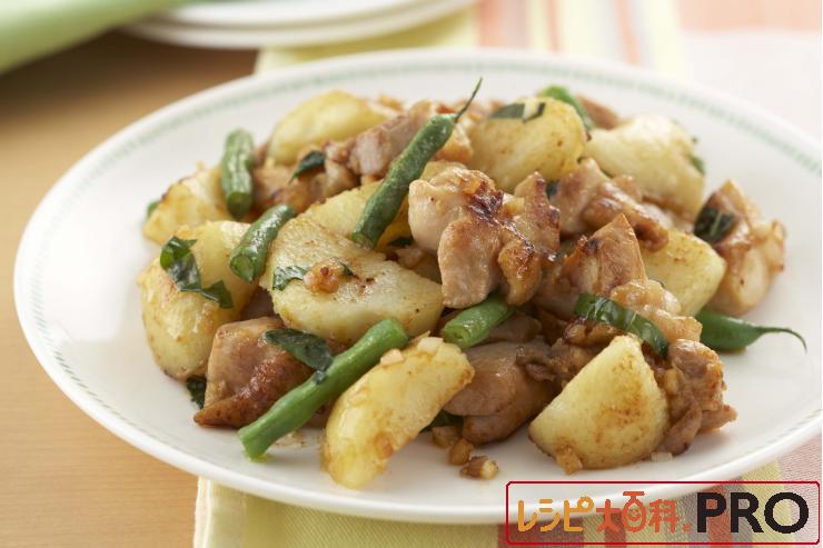 フライパンにオリーブオイルを熱し、(1)の鶏肉を炒める。焼き色がついたらにんにく、(1)のじゃがいも、さやいんげん、「コンソメ」2.5gを加えて火が通るまで炒める。好みでバジルを加えてサッと混ぜる。