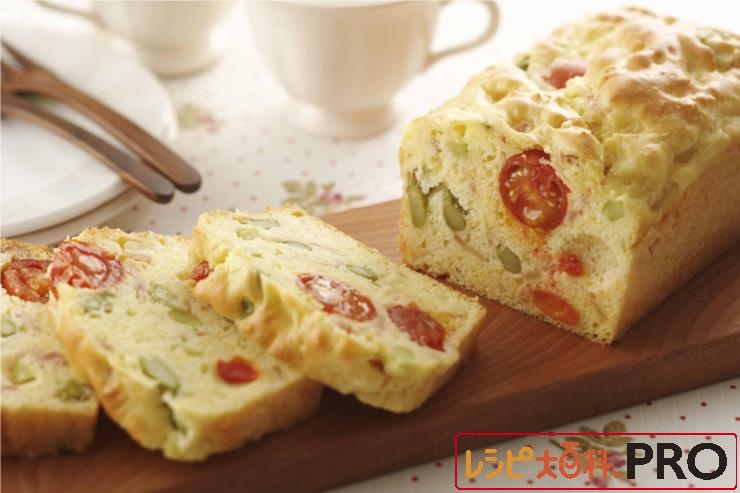 ボウルにホットケーキミックスを入れて、Bを加えてよく混ぜる。(1)、ミニトマトを加えてサッと混ぜる。
