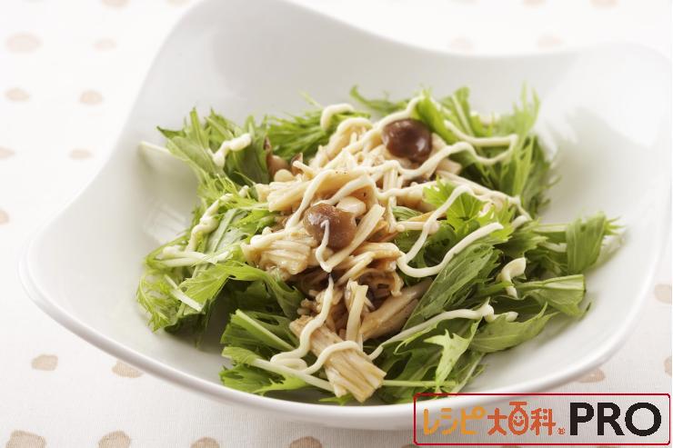 水菜を味つけしたきのこあえとともにいただくサラダ
