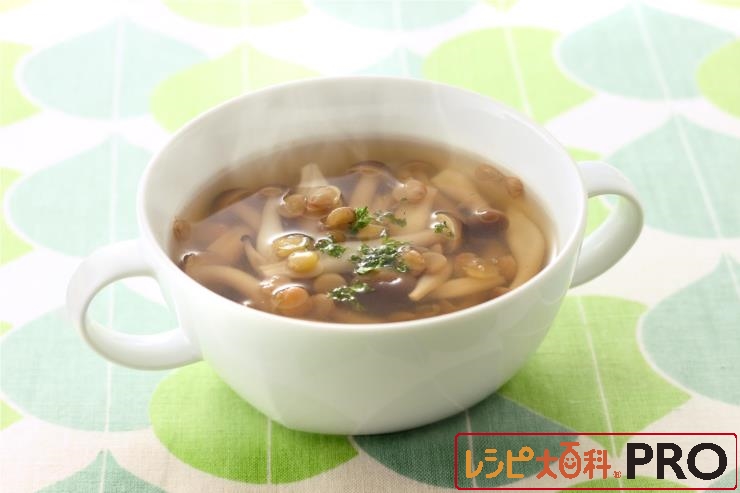 鍋に分量の水を沸かす。しめじを加えて弱火で煮、レンズ豆、「コンソメ」を加えてさらに約5~6分煮る。