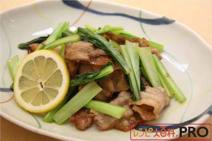 フライパンにサラダ油をひき、豚肉を炒め、小松菜を