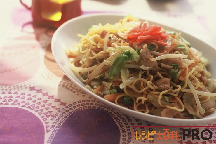フライパンに油6gを中火で熱し、豚肉を入れて炒める。肉の色が変わったら、中華めんを加えて炒め合わせる。