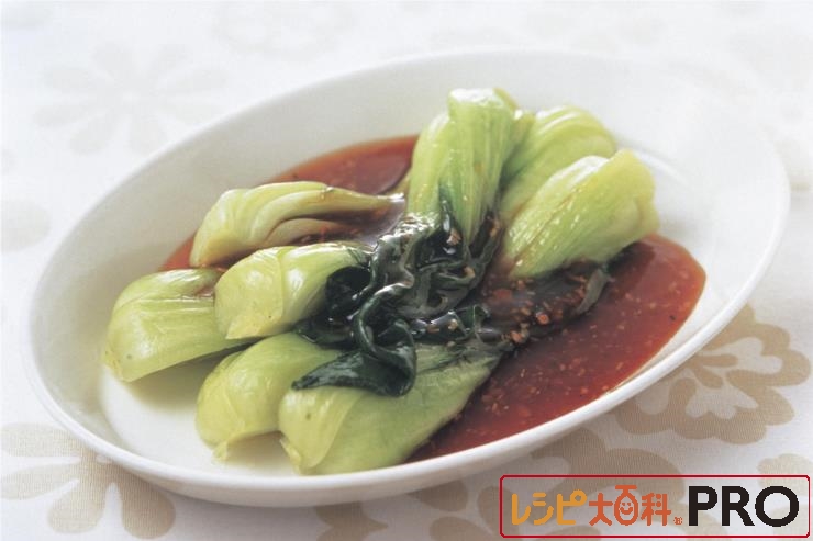 ゆでたチンゲン菜ににんにくの香り漂うコクのあるソースをかけて