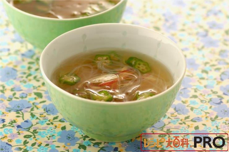 夏野菜を浮かべたさっぱり味のスープは見た目にも涼しげに