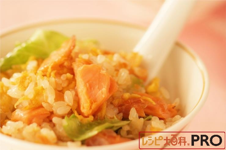 粗くほぐした鮭にレタスの食感と色味が映えるチャーハン