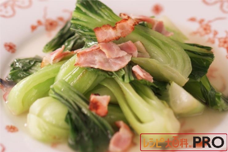 フライパンに油を熱し、ベーコンを軽く炒め、チンゲン菜を炒め、Aを加えてフタをし、30秒ほど蒸らす。