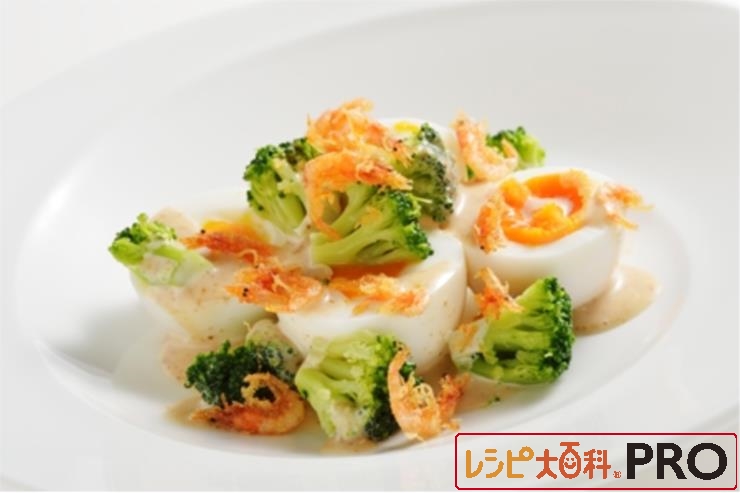 半熟玉子とブロッコリーの胡麻サラダ 桜エビたぬきのせ