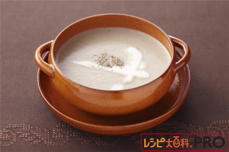 スープカップに(5)を注ぎ、生クリームをかけ、粗びき黒こしょうをふる。