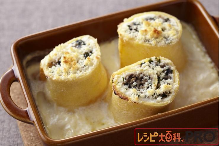 ほうれん草ときのこ、リコッタチーズのカネロニ見立て