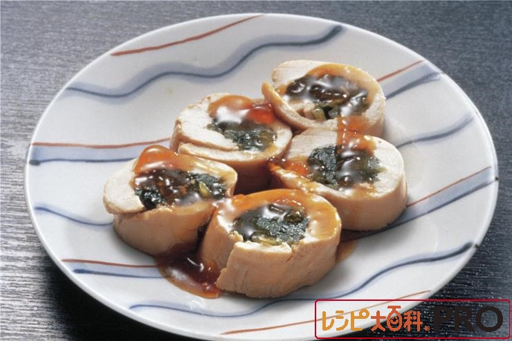 (3)を取り出し、食べやすい大きさに輪切りにして器に盛り、煮汁をかける。
