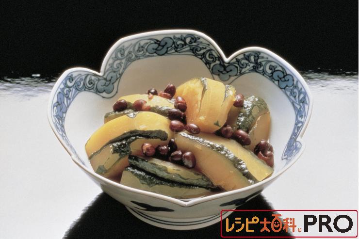 鍋にAを煮立てて(1)を入れ、再び煮立ったら(2)、Bを入れて落としぶたをし、中火でかぼちゃがやわらかくなるまで煮、手早く全体に混ぜ合わせる。