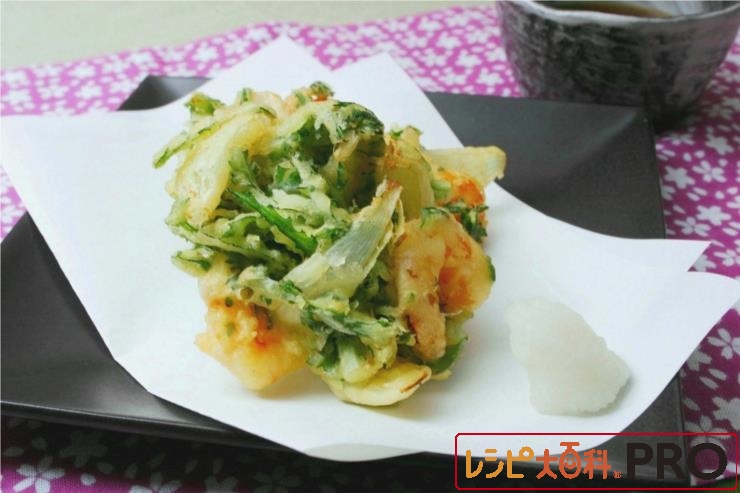 玉ねぎとえびのかき揚げを「ほんだし® かつおだし」の風味が効いた天つゆにつけて