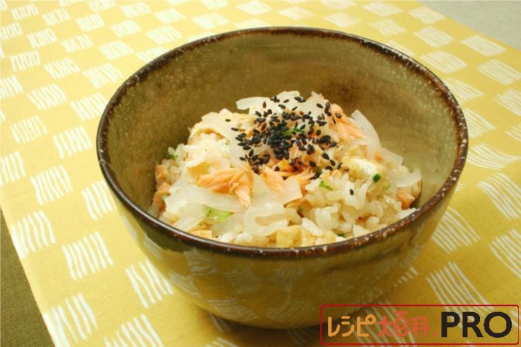 大根の甘さが際立つ炊き込みご飯。焼きほぐした塩鮭を加えて