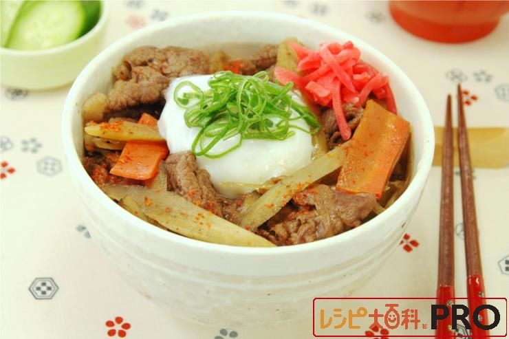 器にご飯をよそい、(1)を盛り、温泉卵をのせてCを飾る。