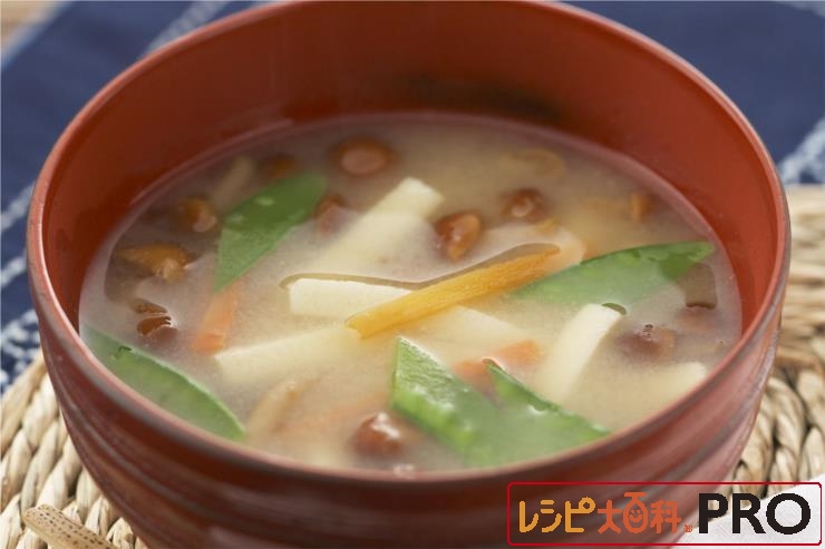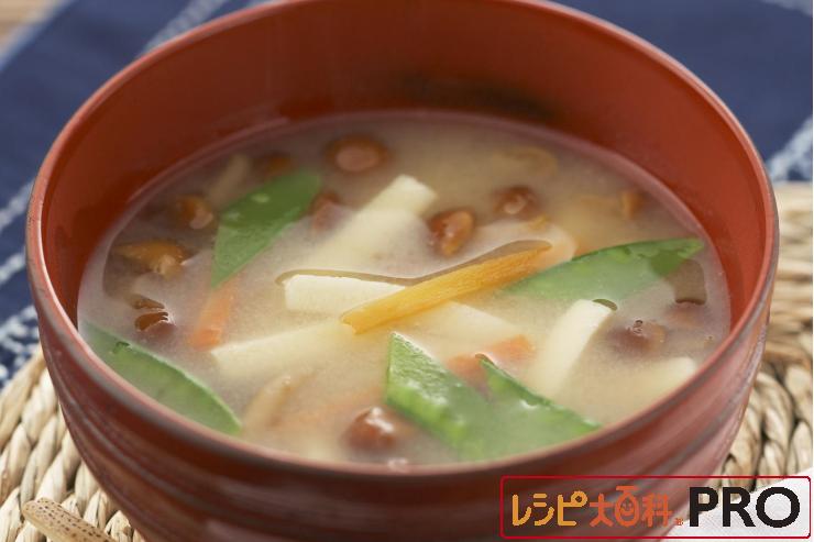 信越のみそ汁(高野豆腐、なめこ、きぬさや、にんじん)