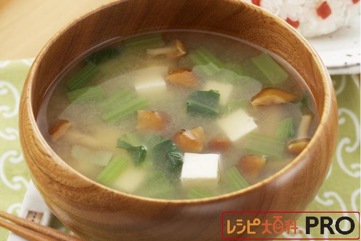 なめこと豆腐の定番味噌汁に小松菜を入れて彩りよく
