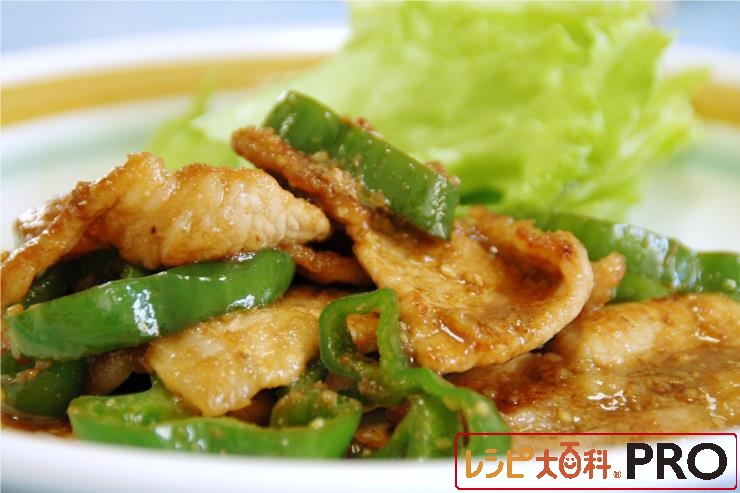 フライパンに油を熱し、(1)を炒め、火が通ったらピーマンを加えて炒める。Aを加え、とろみがでたら皿に盛り、ちぎったレタスを添える。