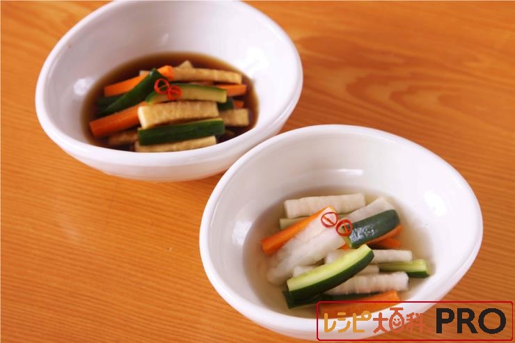 密封できる保存袋などに、A、Bをそれぞれ合わせ、Cをそれぞれ加え、6時間漬けこむ。