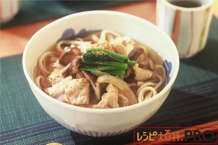器にゆでたうどんを盛り、(3)の具をのせ、(4)のかけつゆを注ぎ、ほうれん草をのせ、好みで七味唐がらしをふる。